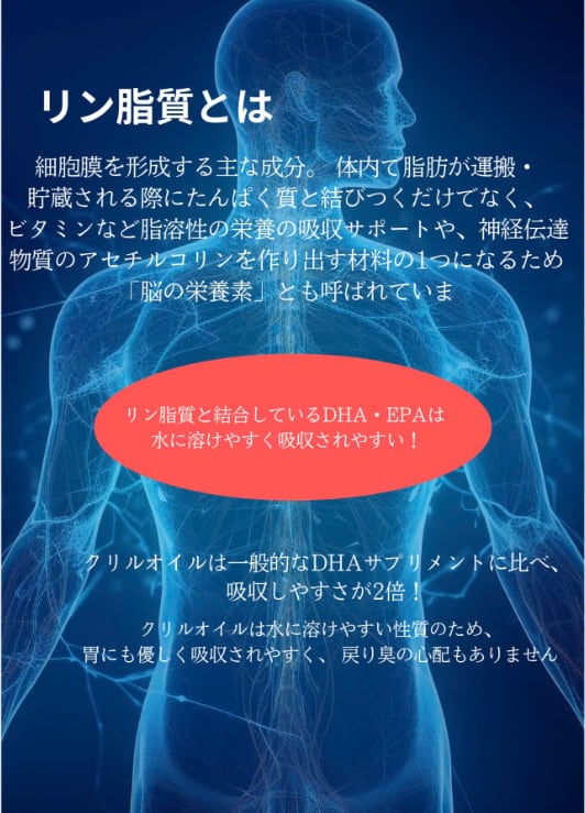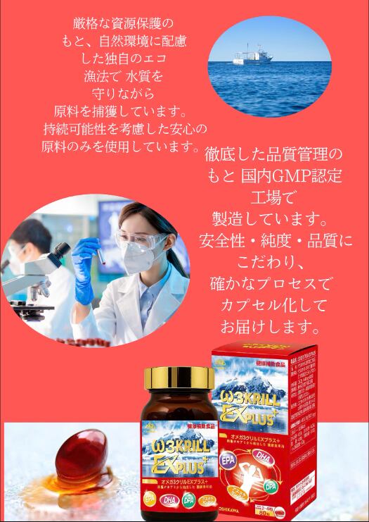 南極オキアミから抽出した高品質なクリルオイルを使用した健康補助食品。EPA、DHA、DPAなどのオメガ3系脂肪酸に加え、天然アスタキサンチンを含有。毎日の健康維持や生活習慣のサポートに最適です。