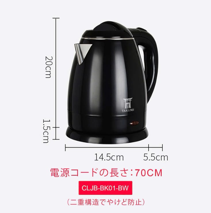 TAKUMI 電気ケトル1.2L やけど防止/空焚き防止/自動電源オフ/高速沸騰
